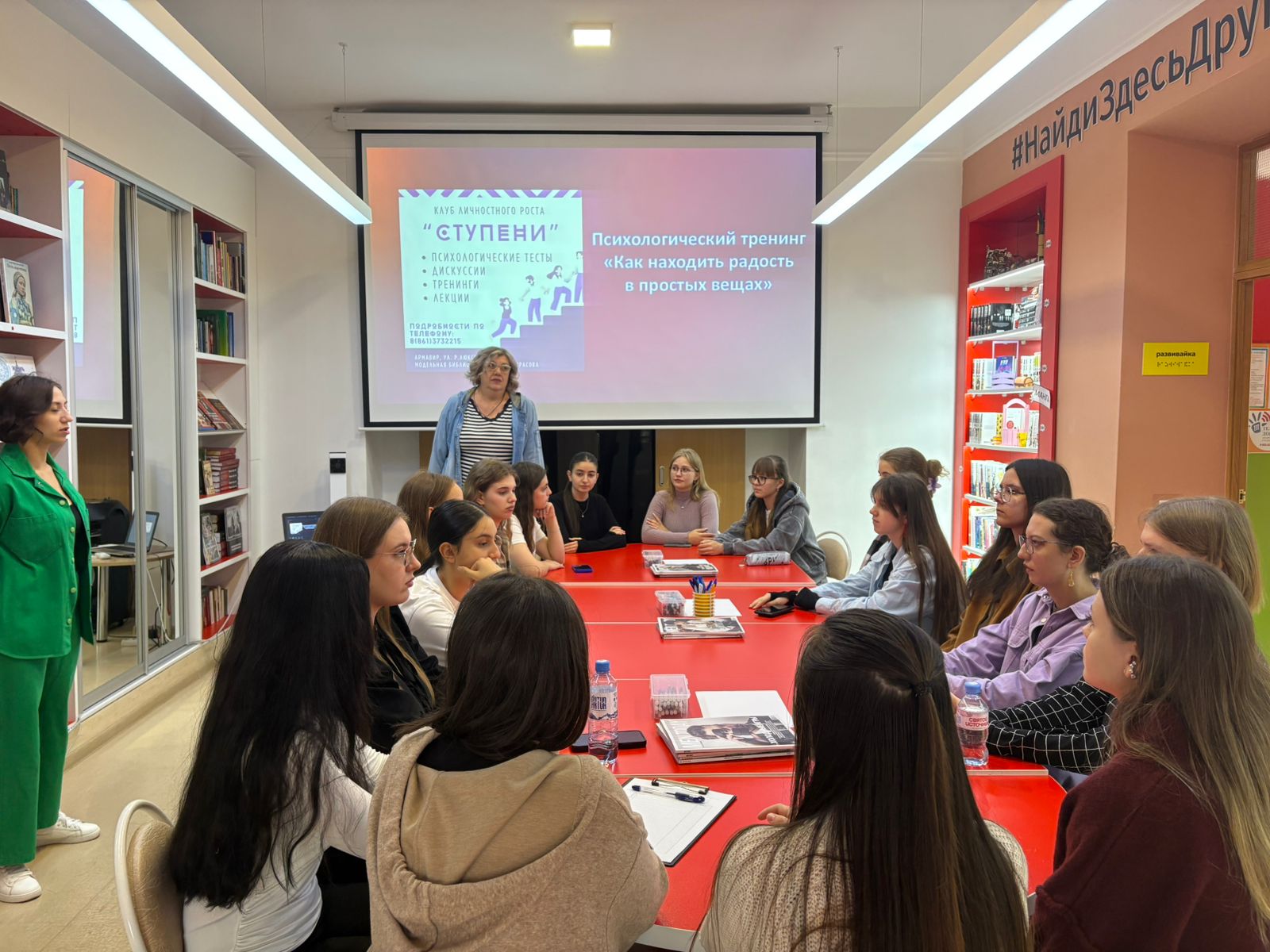 11.09.2025 на базе модельной библиотеки им.Некрасова преподаватели психолого- педагогического факультета, доценты Ромашина Е.В., Терсакова А. А., Шкуропий К. В., Егизарьянц М. Н., а так же сотрудники библиотеки провели ПСИХОЛОГИЧЕСКИЙ ТРЕНИНГ "КАК НАХОДИТЬ РАДОСТЬ В ПРОСТЫХ ВЕЩАХ"