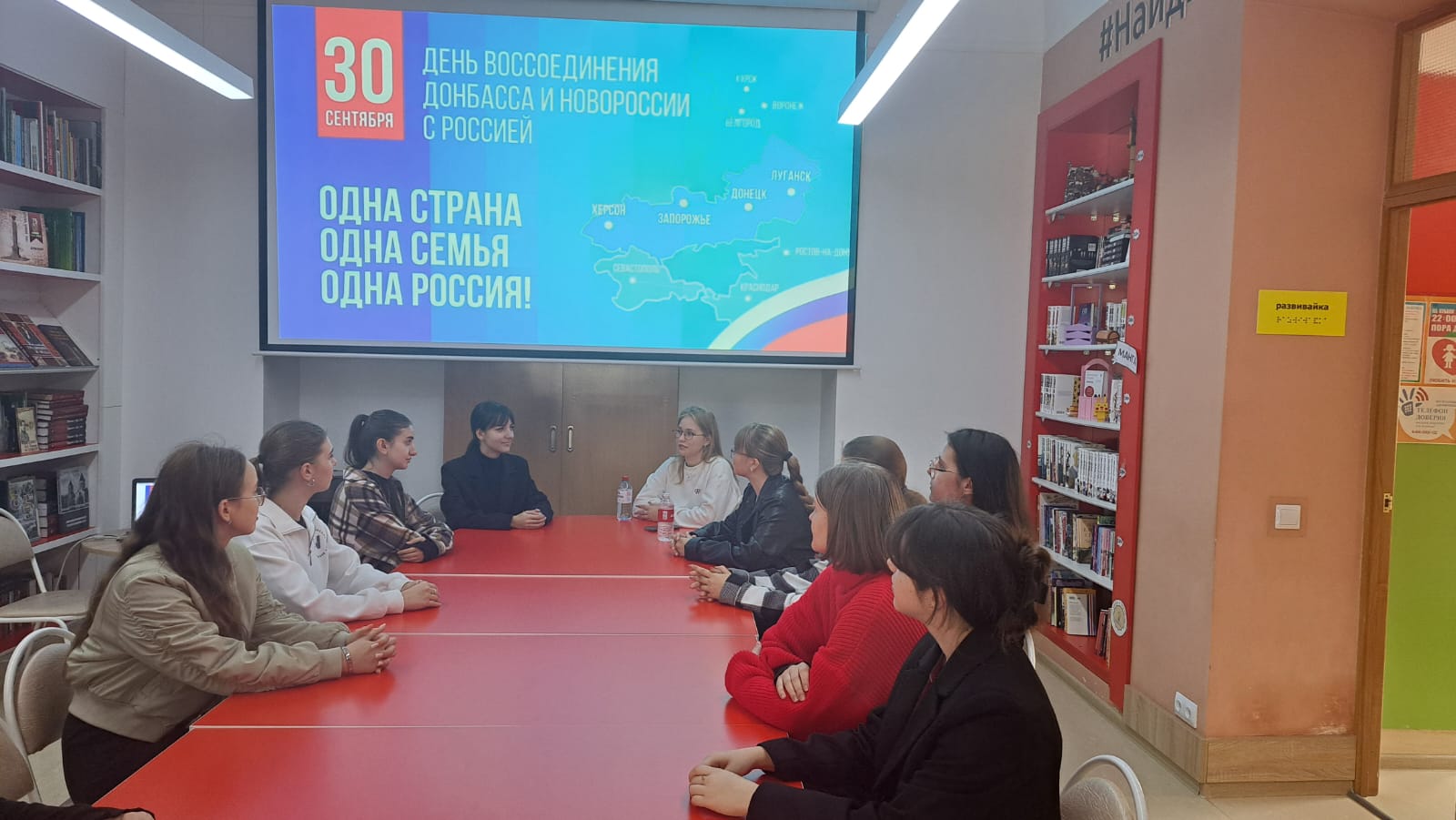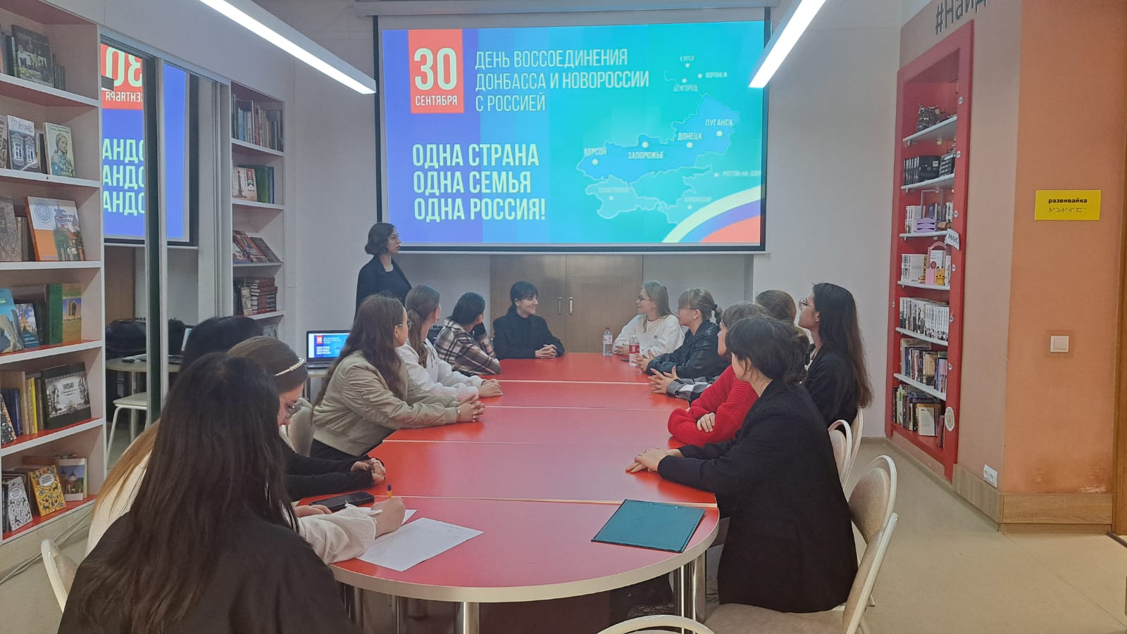 02.10.25 преподаватели психолого-педагогического факультета Ромашина Е.В., Терсакова А.А., Шкуропий К.В., Егизарьянц М.Н. на базе медийной библиотеки им.Некрасова провели мероприятие - патриотический час "В единстве с Россией"